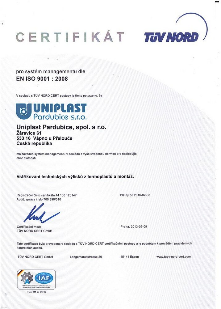 im Oktober 2006 wurde das Umweltmanagementsystem nach ČSN EN ISO 14001:2005 zertifiziertim Januar 2007 wurde das Qualitätsmanagementsystem nach ISO/TS 16949:2002 und DIN ISO 9001:2000 zertifiziert